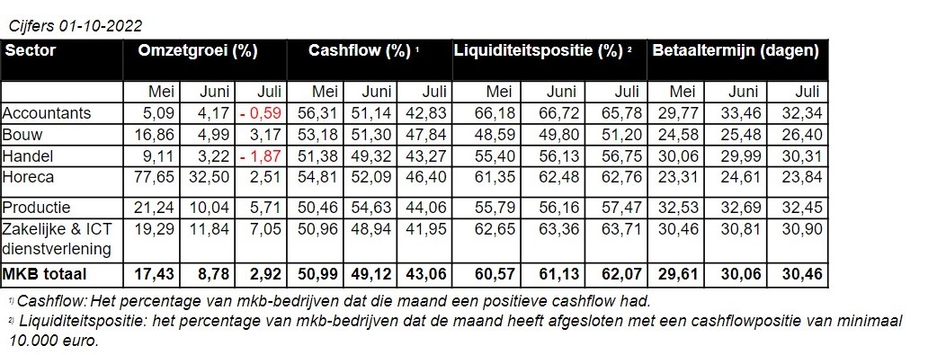 Naast ondernemers in de handel, hebben ook accountants te maken met een omzetdaling. In juni bedroeg de gemiddelde omzetdaling 0,59%. Marcus Schuite vervolgt: “Het waren voor accountants razend drukke tijden, waarin zij veel werk hebben verzet om coronasteunaanvragen in te dienen. Dat werk is nu weggevallen en een verklaring voor de omzetdaling.” De afname in omzetgroei onder horecaondernemers is volgens Schuite meer zorgelijk. “Horeca is de sector die de gemiddelde omzetgroei het sterkst zag dalen, van 32,50% in juni naar 2,51% in juli. De oorzaak hiervan is vermoedelijk tweeledig. Enerzijds is het personeelstekort in deze sector een enorme uitdaging en een rede waardoor zij niet kunnen draaien zoals ze willen. Anderzijds zien we dat consumenten gaan bezuinigen op uitjes en restaurantbezoeken nu alles duurder wordt. Het zijn dus echt spannende tijden voor horecaondernemers wat ook blijkt uit de berichtgeving van het CBS van deze maand.”