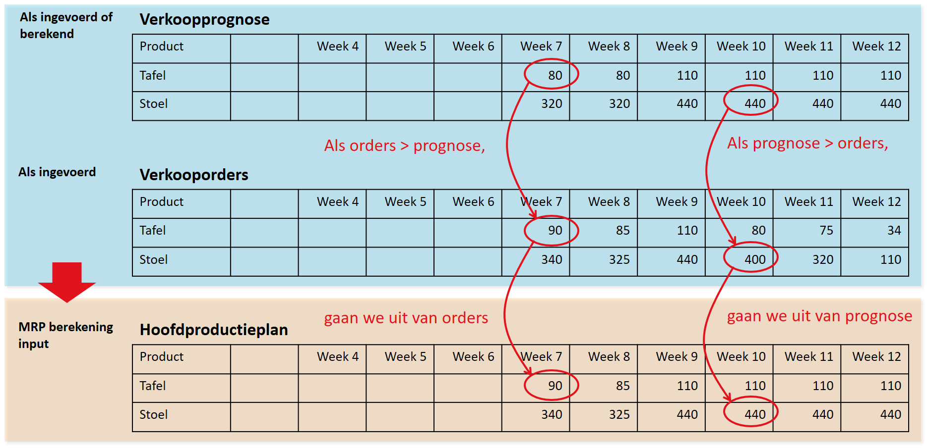 Voor de aansturing van de productie stellen we daarom een hoofdproductieplan (in het Engels ook wel Master Production Schedule, MPS, genoemd) op, waarin zowel de verkoopprognoses als de verkooporders worden verwerkt: Van producten waarvoor een prognose gebruikt wordt, produceren we (per periode) het hoogste aantal uit de prognose en de verkooporders. Van de producten die puur ordergestuurd zijn, maken we geen prognose en gaan we alleen uit van de verkooporders.