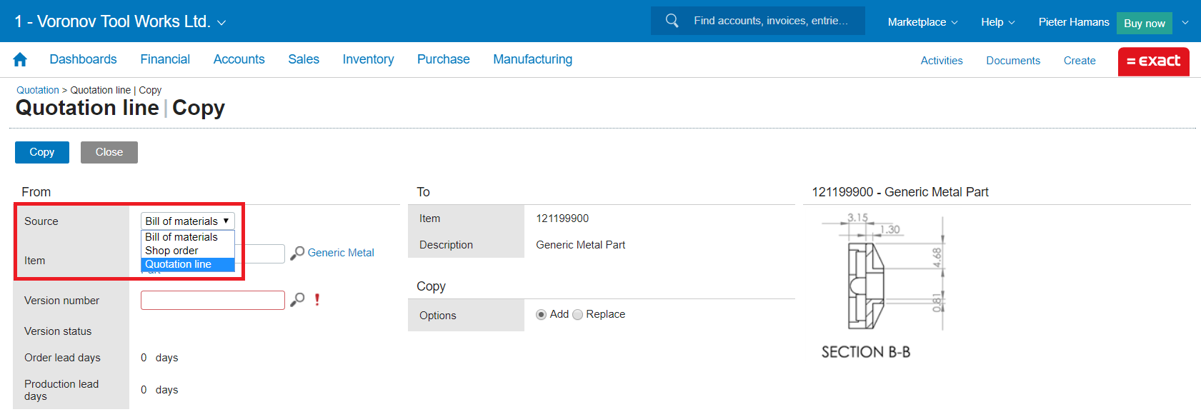 Exact for Manufacturing Ease of Use: Quotation line copy of BOM, shop order or quotation line